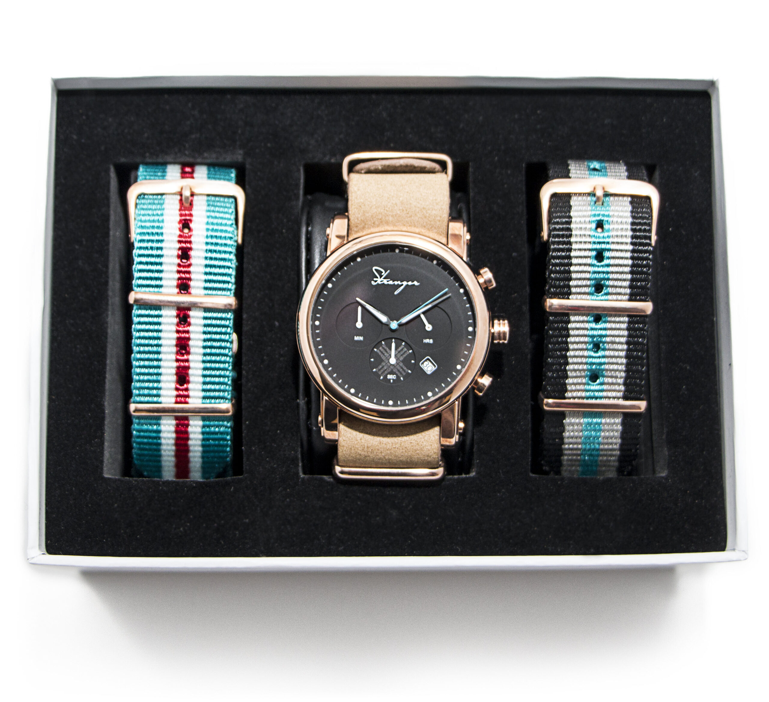 Mínimo Gold Model is the definition of power. Elegantly packaged with 2 extra heavy nylon Nato straps in varying colors make this an ultimate accessory for both Men and Women.