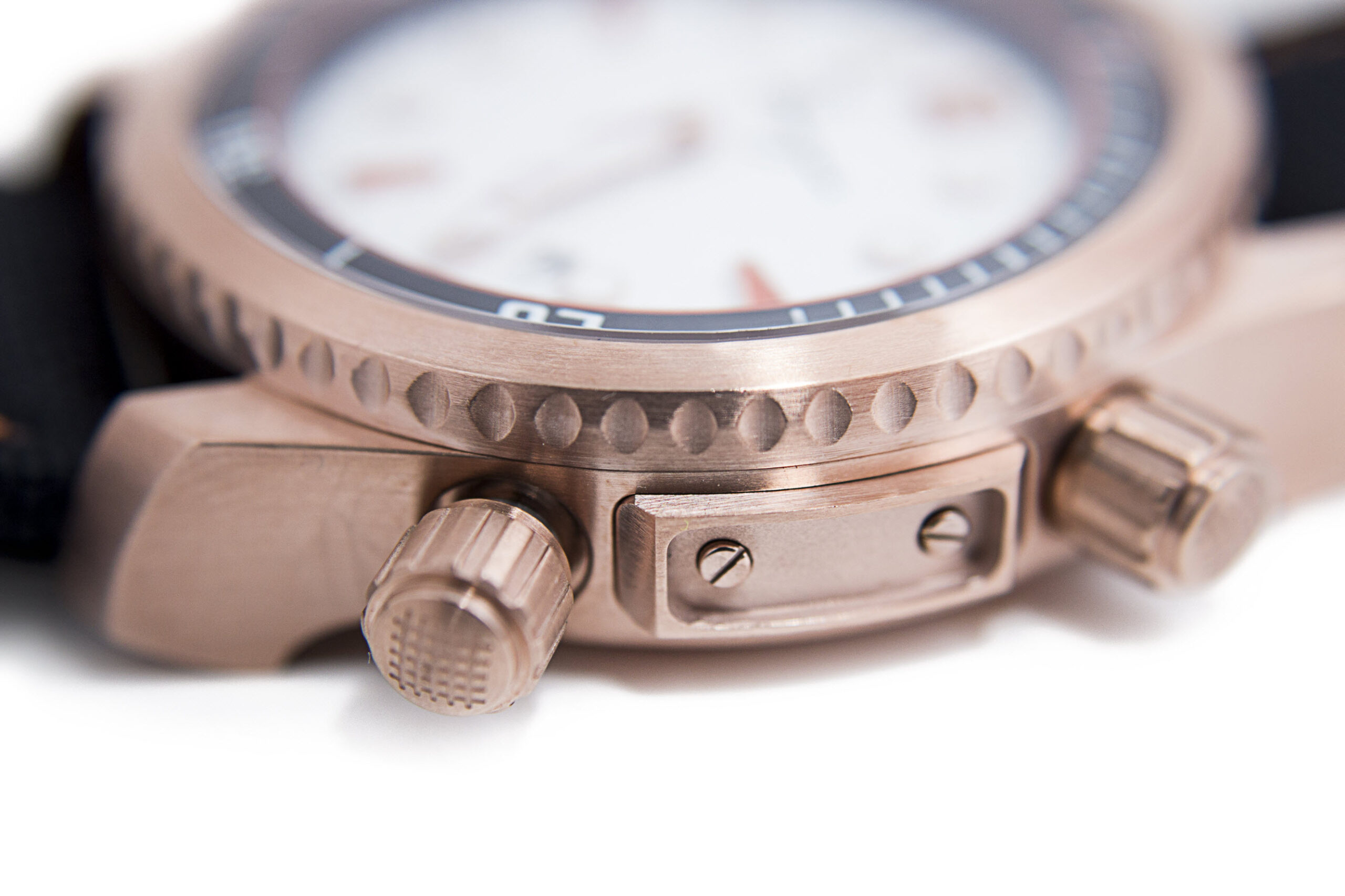 Part of the Ocean Predator Collection. The Leopard Seal features White hammered dial on this 44mm brushed rosegold case, with dual crown functions for easy bezel, time and date settings.